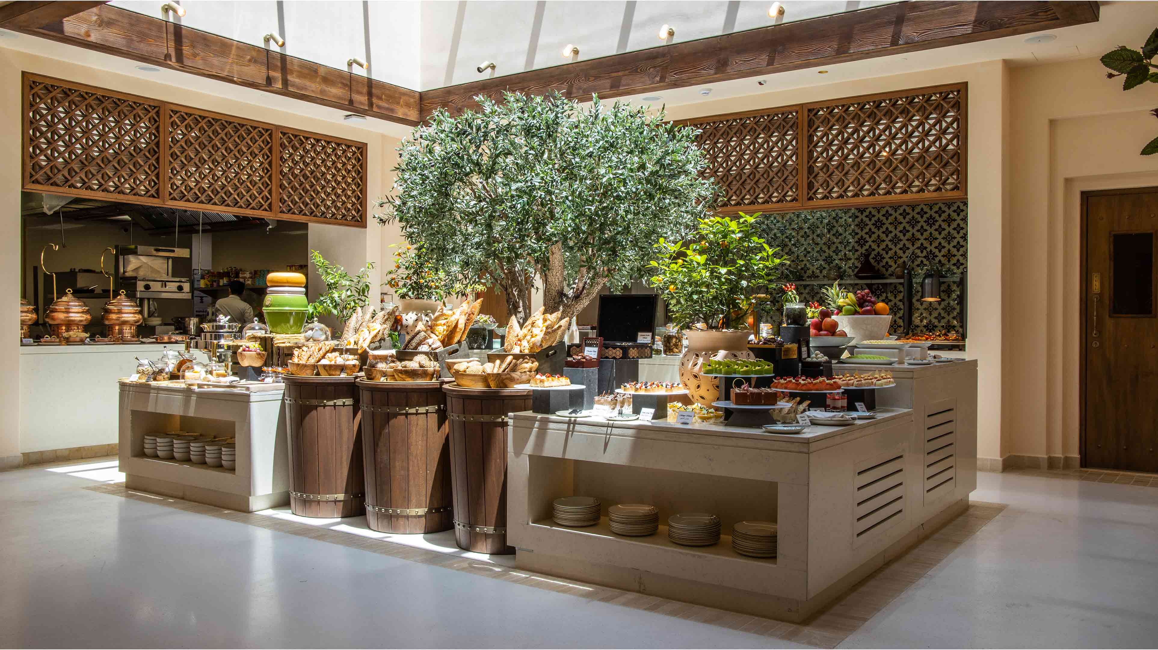 Chefs offer a taste of Arabia where flavours of the desert are brought to life. Classic Lebanese dishes are prepared in big, open-style kitchens showcasing charcoal kebab grills and a traditional saj oven.