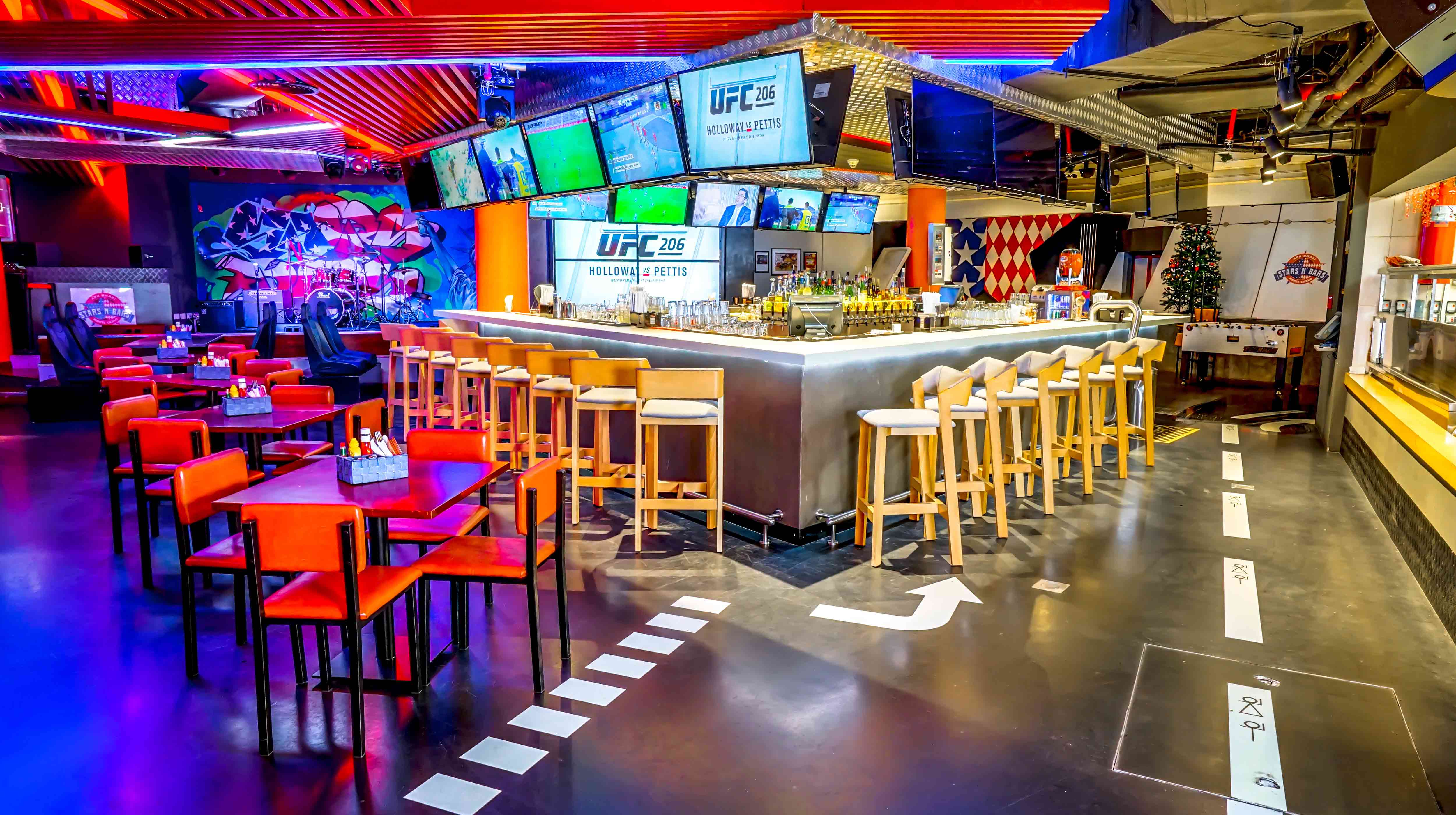 Stars N' Bars Abu Dhabi es un concepto único y pionero de bar de deportes situado en pleno centro de la isla de Yas. Inspirado en el famoso Stars N' Bars de Montecarlo, el bonito entorno del lujoso puerto deportivo Yas Marina y la pista de carreras de F1™ son el telón de fondo perfecto para recrear el glamur de este establecimiento en el corazón de Abu Dhabi. Stars N' Bars ofrece una amplia selección de bebidas, cocina de estilo estadounidense y diversos platos europeos y asiáticos, todo ello en un ambiente desenfadado. Gracias a los varios televisores de pantalla plana, no te perderás ni un segundo de la acción deportiva.